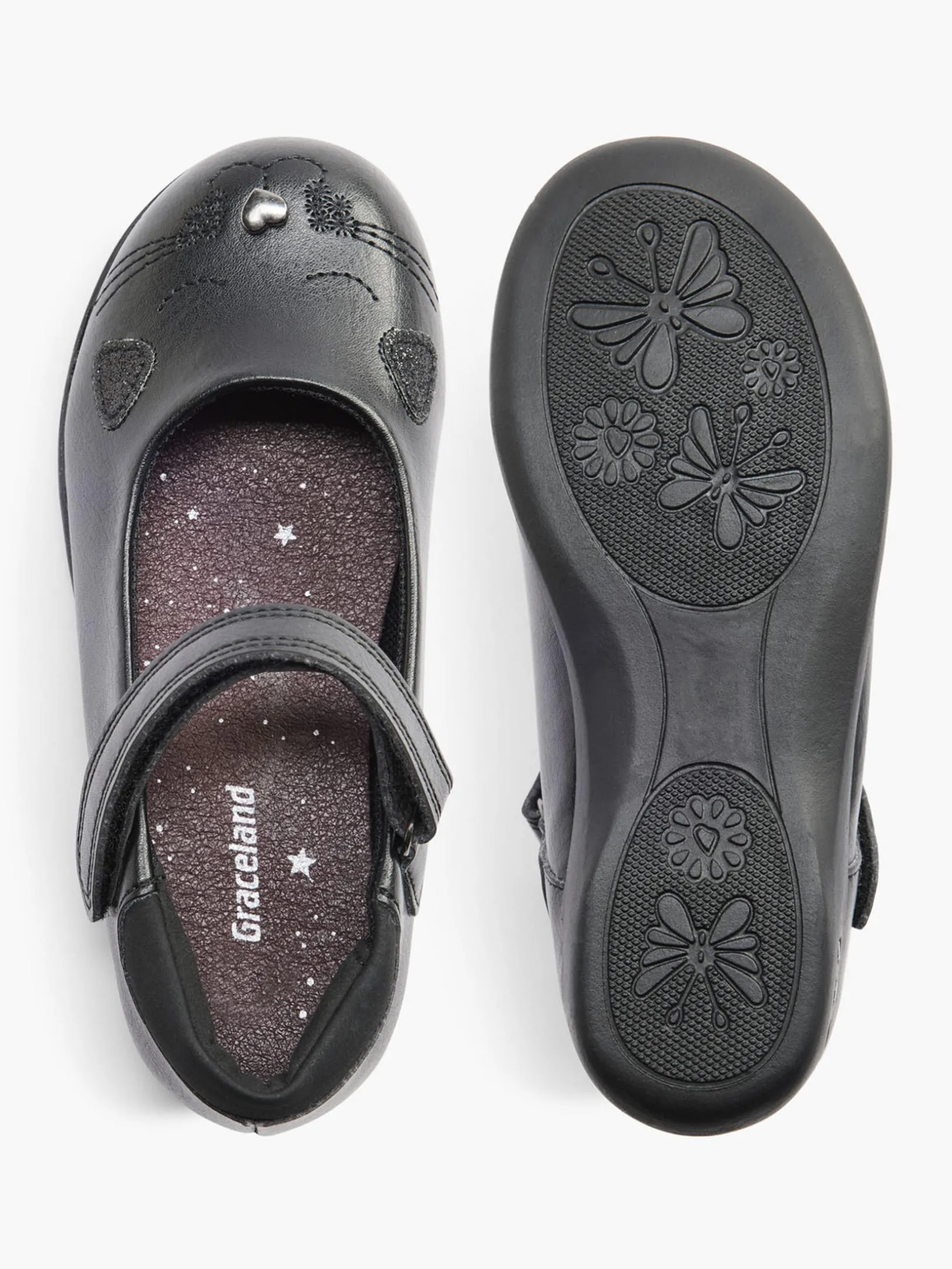 Graceland’s patent T-bar shoes are a back to school classic for young girls. The fully cushioned inner is built to support growing feet, and the rubber outsole brings added bounce and traction. Ideal for everyday wear, these shoes are comfortable, stylish and durable. With a fully adjustable rip tape strap, these shoes will suit fast-growing feet. Plus, the sleek, patent design will have each girl heading to school with a sparkle in every step.
