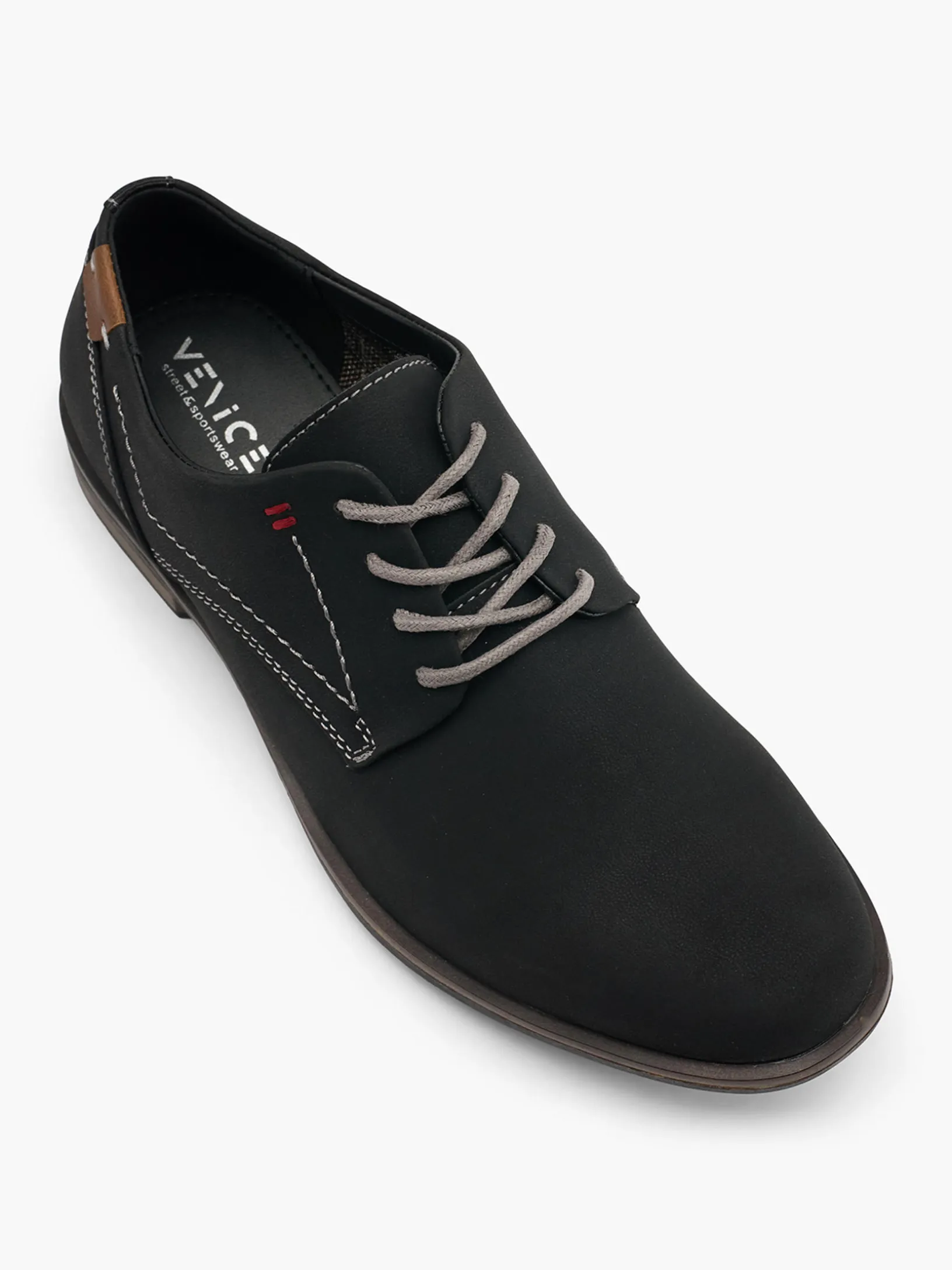 These men’s formal lace-up shoes from Venice are available in black with brown details and grey laces. These simple and sleek shoes are perfect for wearing to work or to formal events. Both simple and durable, these affordable shoes will complete a wide range of outfits both formal and casual. Available in sizes 6 to 11.